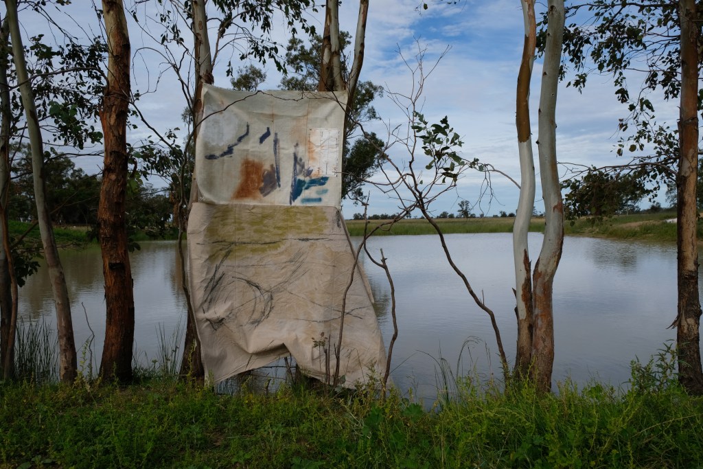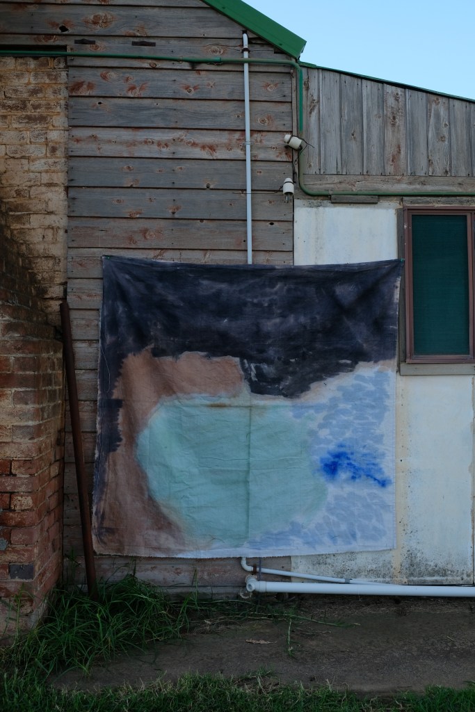Moonrise over Dam, natural dyes (eucalyptus), dry earth pigment, found charcoal, oil and acrylic on nylon wool pack and cotton drop sheet, 172cm x 151cm