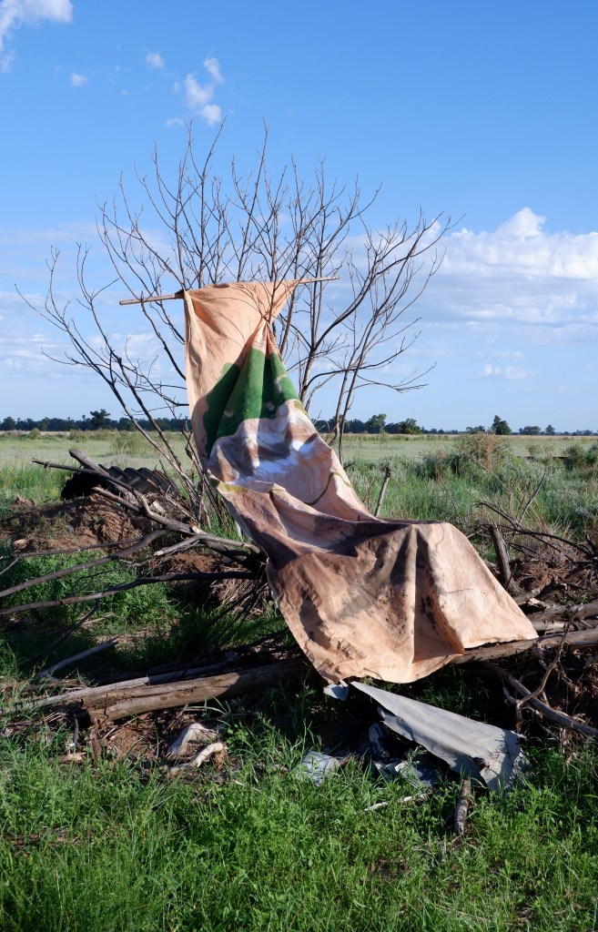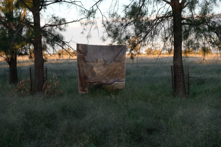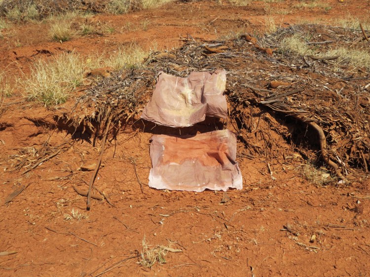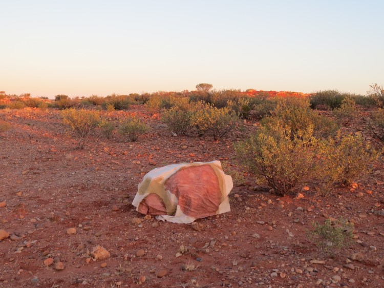 Buried, river red gum dye (leaf and bark), found charcoal, dust, and rust on buried repurposed cotton fabric, August 2021, Titjikala NT (Tapatjatjaka)