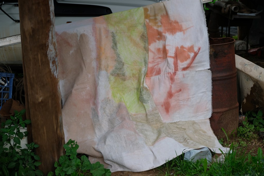 Blanket Study, plant-based dyes, iron water, dry pigments, gum arabic and thread on second-hand linen