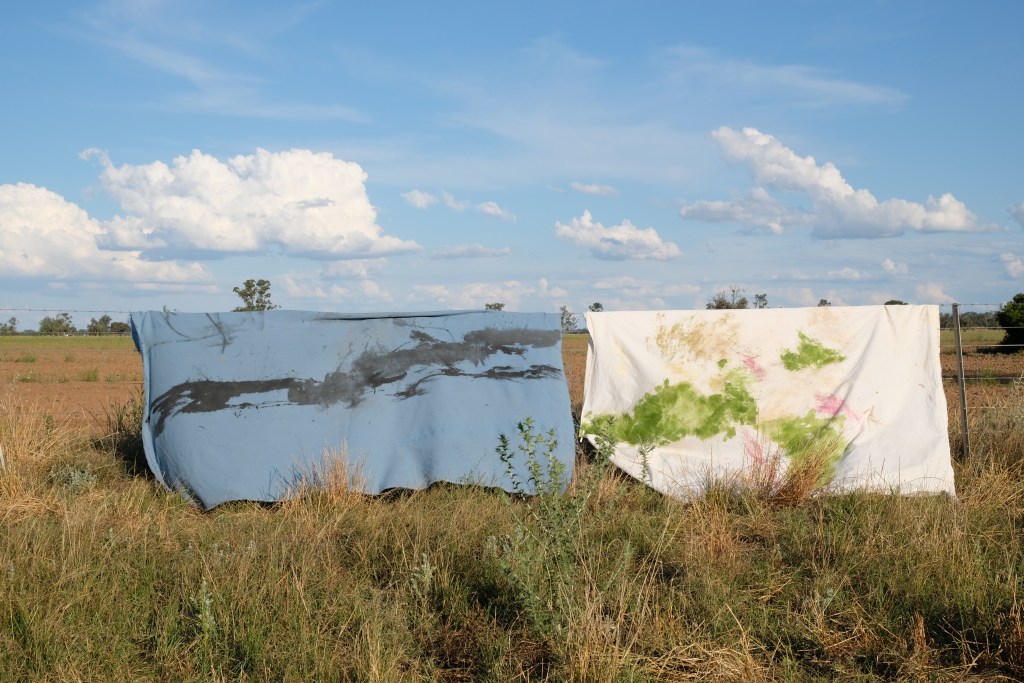 Paddocks, oil pastel and natural dye (eucalyptus) on cotton drop sheet, 176cm x 149cm
