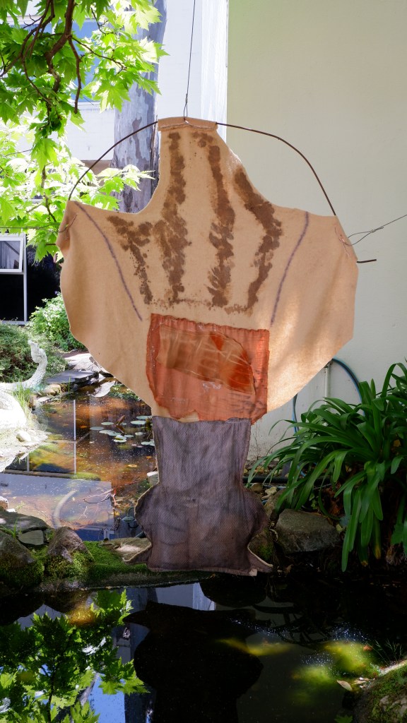 dye, iron water and thread on Belconnen Vinnies and Green shed underground fabric scraps. Pegged