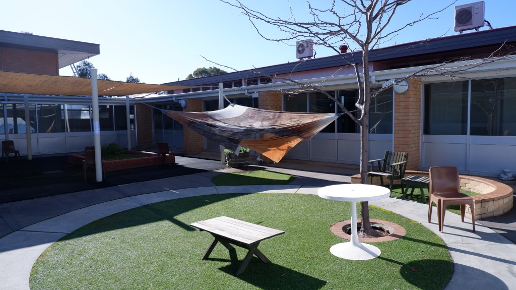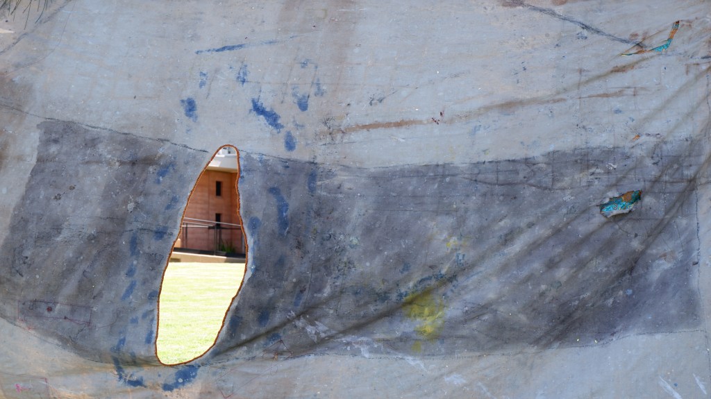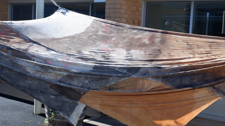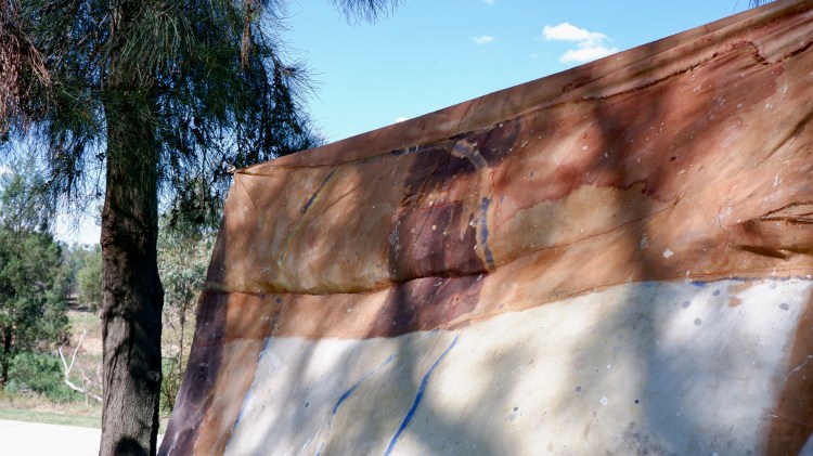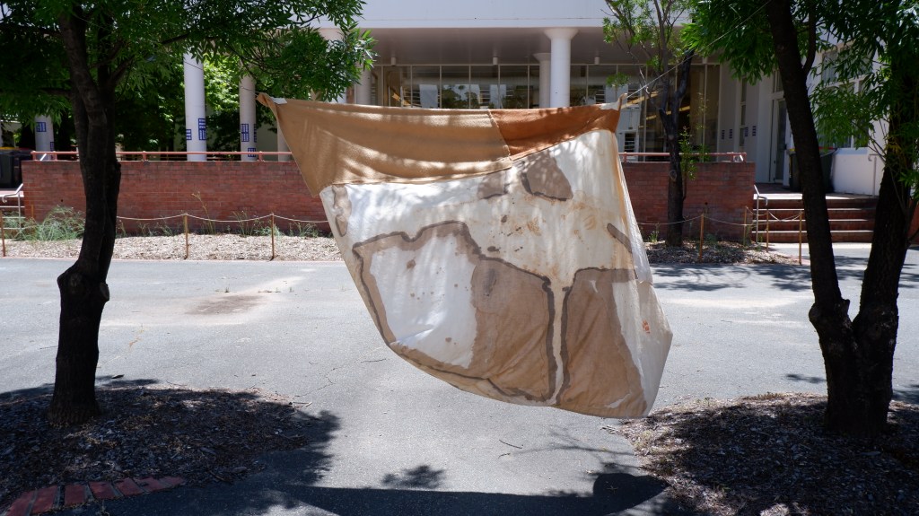 Awning 2023, Eucalyptus dye, thread and iron water on gifted painters drop sheet, quilting fabric from Cooee Village and studio fabric scraps installed in the Chifley Health and Wellbeing Club courtyard.