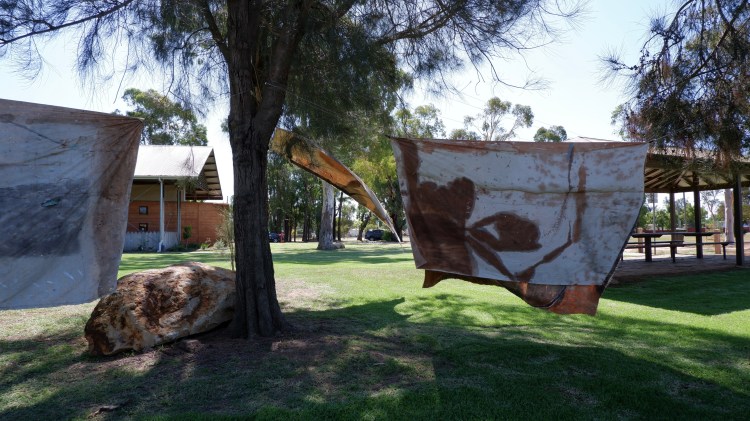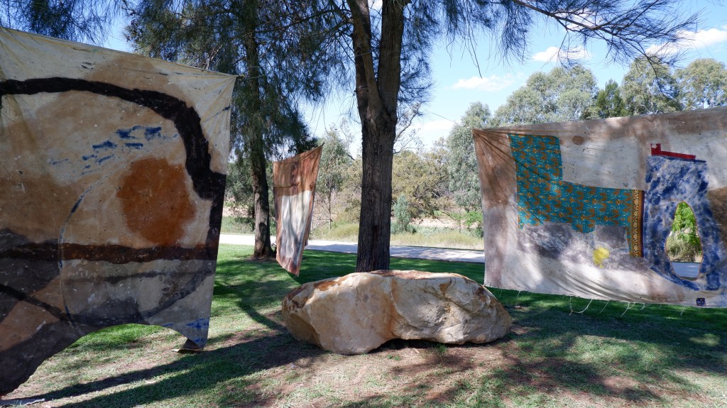 (Left to right) Moonrise, 2023, dry pigments, walnut oil, local plant dyes, iron water, thread and secondhand quilting fabric fro Cooee Village on old painters drop sheet. Bark, 2023, dry pigments, walnut oil, local plant dyes, iron water, thread and secondhand quilting fabric from Cooee Village on old painters drop sheet stuffed with eucalyptus bark and leaves. River Run, 2023, dry pigments, walnut oil, plant-based dyes, iron water, thread and secondhand quilting fabric from Cooee Village on old painters dropsheet.