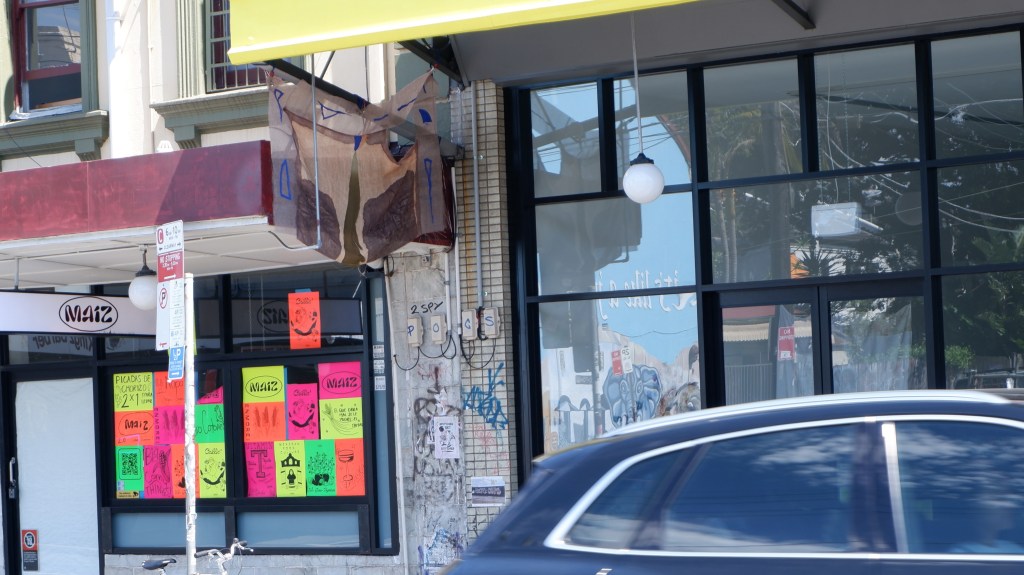 (Left to right) Fencing, 2023, Eucalyptus dye, thread, Indigo’s scrap fabric, Julia’s scrap fabric and Nancy’s woollen blanket secured to temporary fence and Hometown Trees and Canberra Rain, 2023, Gilgandra gum tree dye, Canberra rain and sun, thread on scrap fabric glued to fence