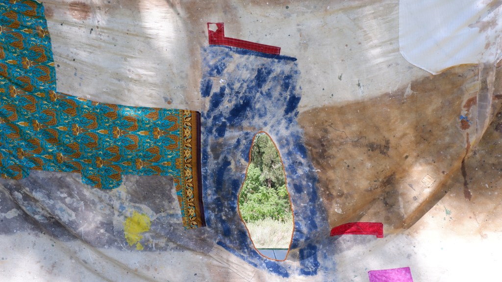 Moonrise, 2023, dry pigments, walnut oil, local plant dyes, iron water, thread and secondhand quilting fabric fro Cooee Village on old painters drop sheet (detail).