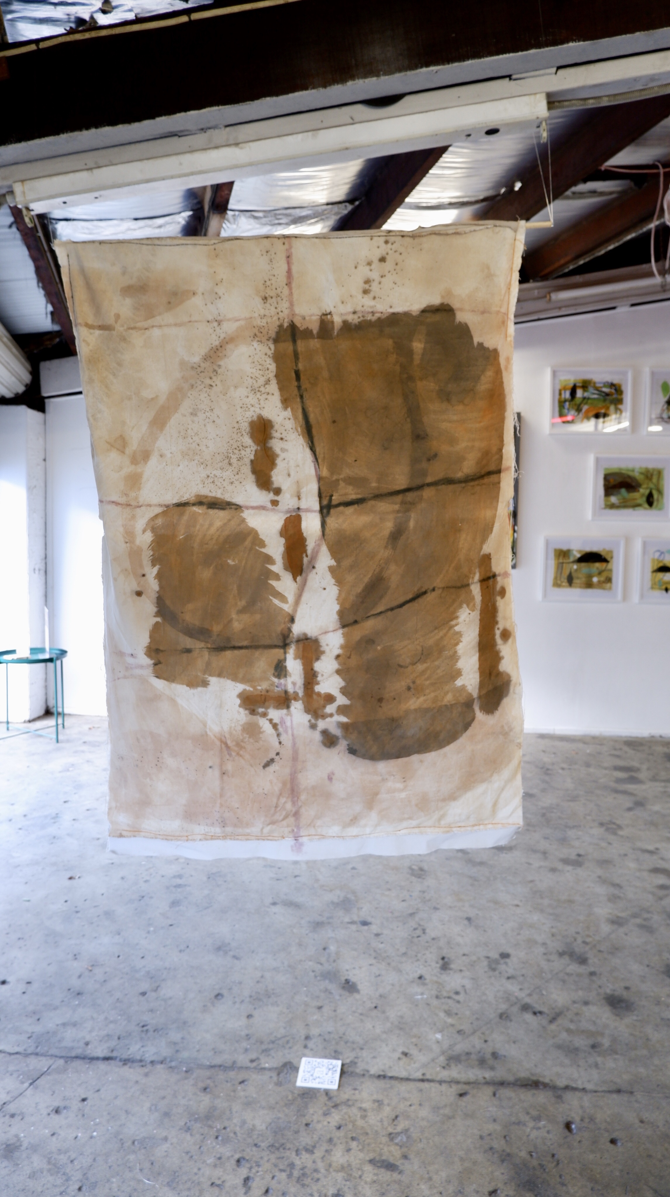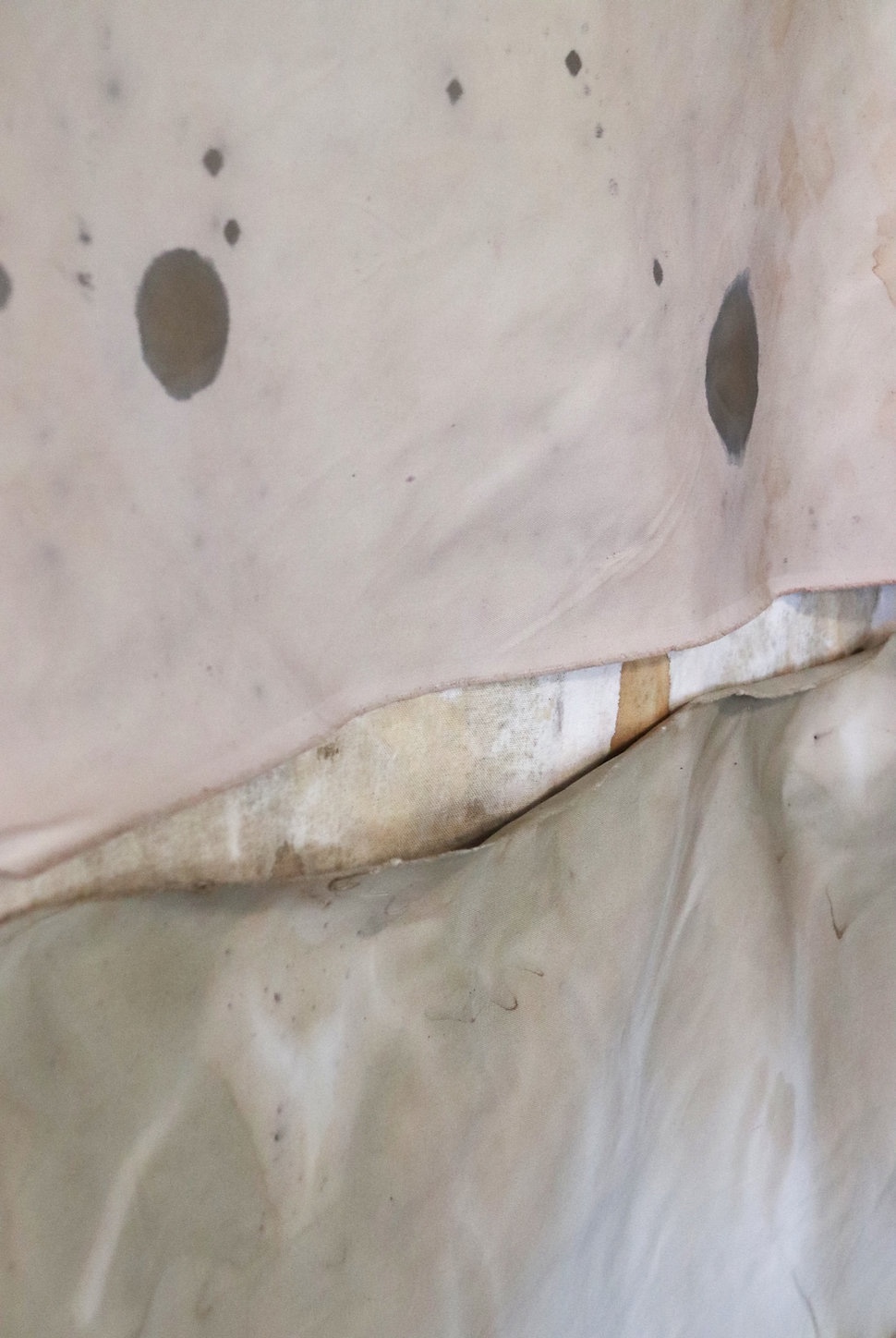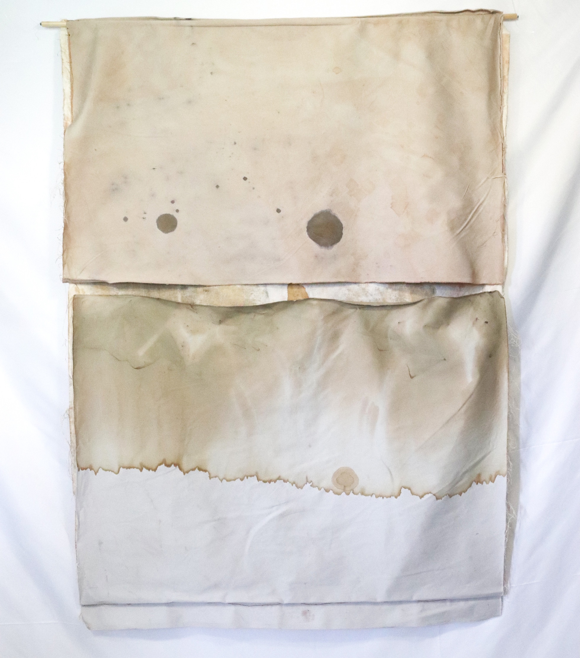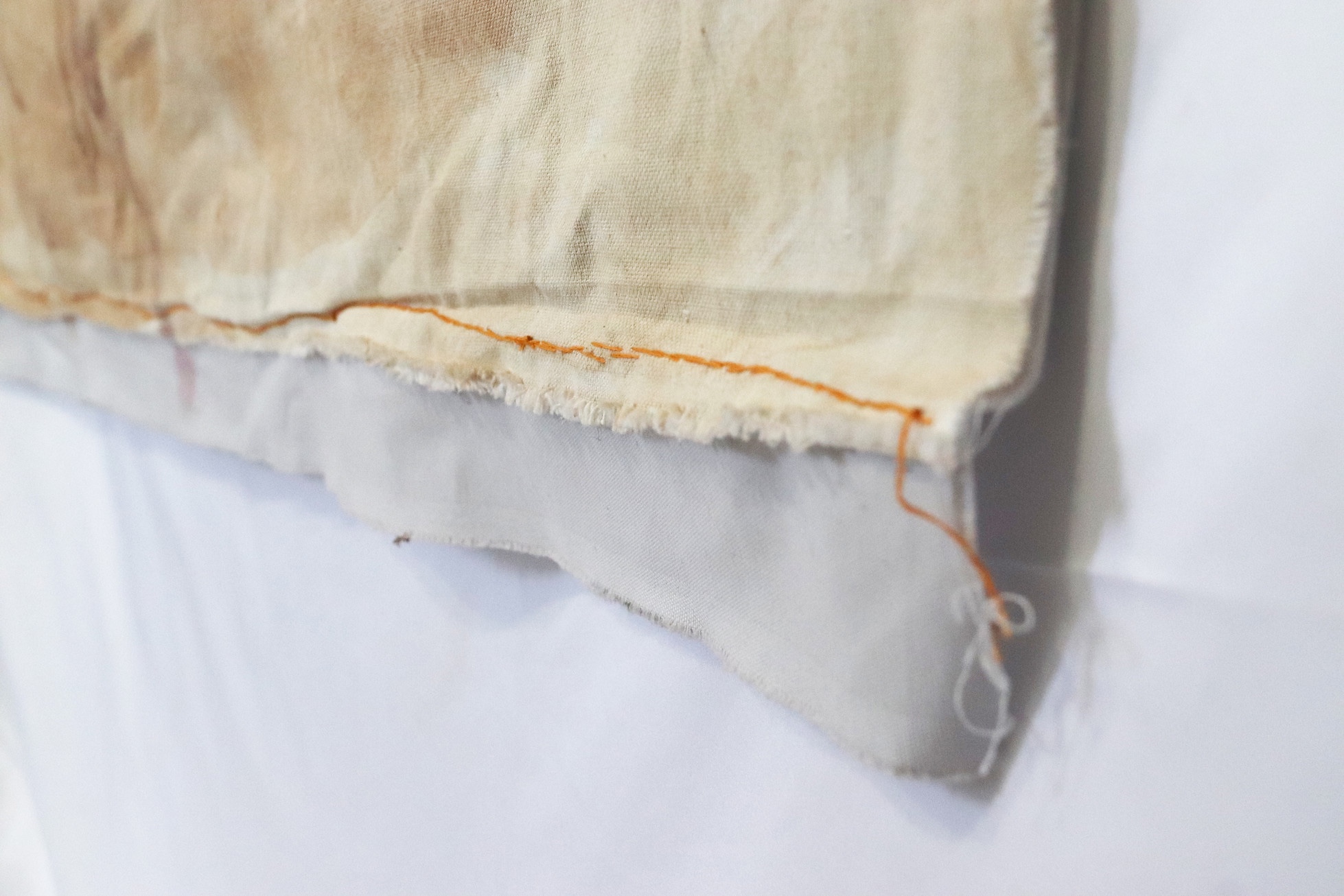 Eucalyptus bark dye, avocado skin dye, poinciana tree flowers, iron mordant, rainwater, and thread on linen and reclaimed fabric