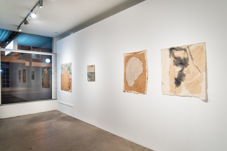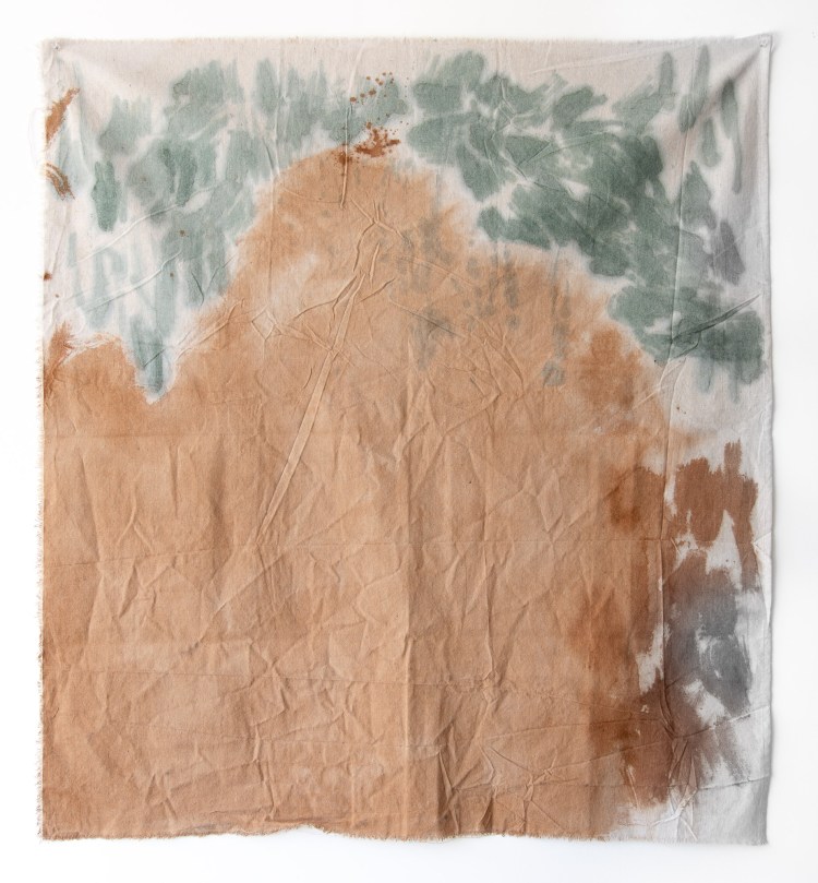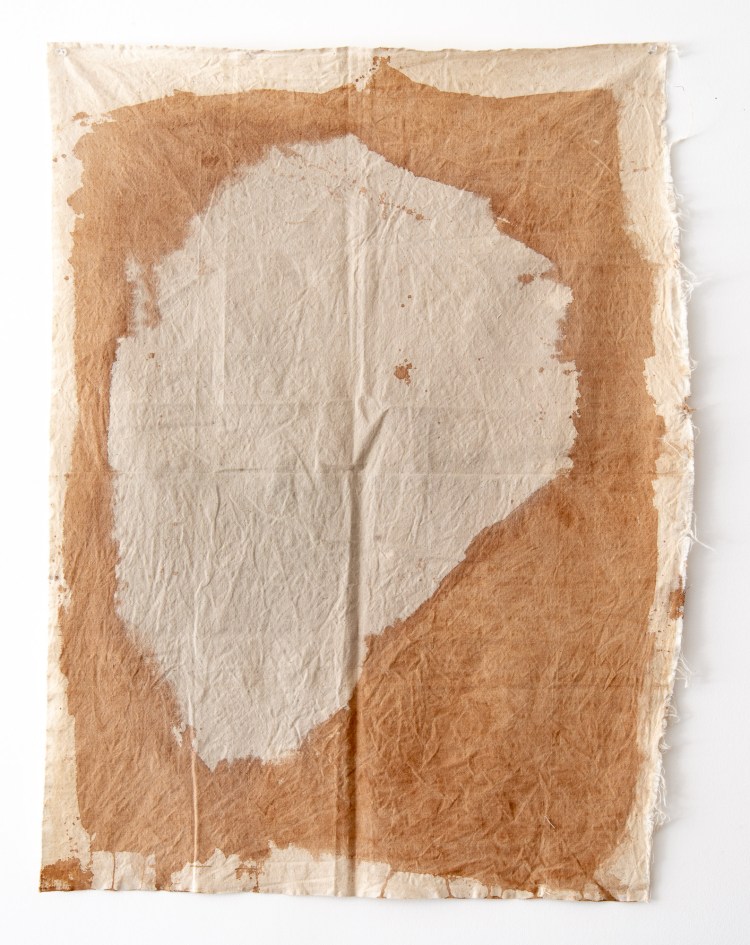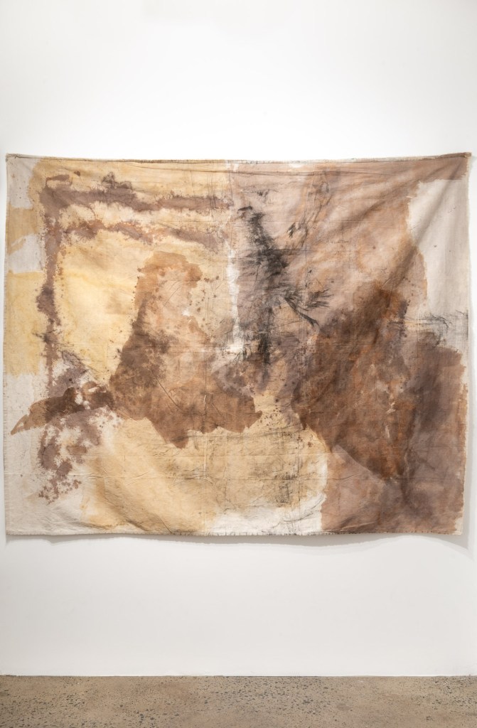 McIntosh’s Canvas Works form a meditation on the specificity of place and the natural cycles that transform them. Each fold, residual fabric crease and indelible stain forms part of a living narrative that reflects on past processes in the land as well as future adaptations. McIntosh’s practice imbues a tangible closeness to rural Australia that acknowledges Indigenous connection to land and the mark of colonisation. Eucalyptus dye, bushfire charcoal and earth pigments saturate McIntosh’ work with deep ecological histories, allowing the landscape to speak through the work itself.