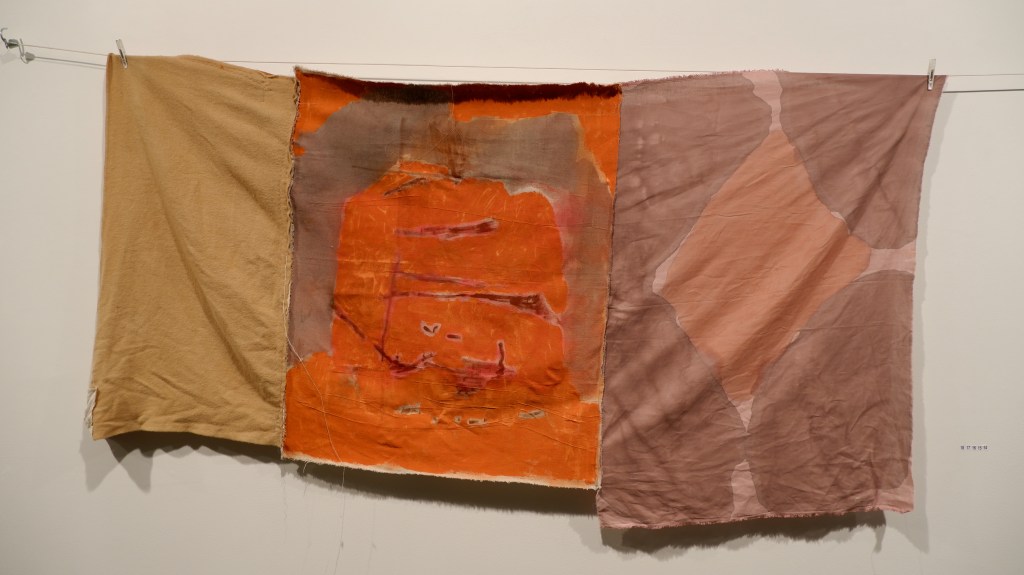 Clementine Belle McIntosh, Dickson to Gilgandra, 2023, old house paint, eucalyptus dye, avocado and onion skin dye, iron water and thread on roadside woolen blanket, cut up painting and Kate’s scrap fabric.