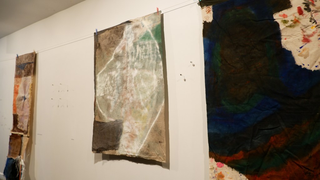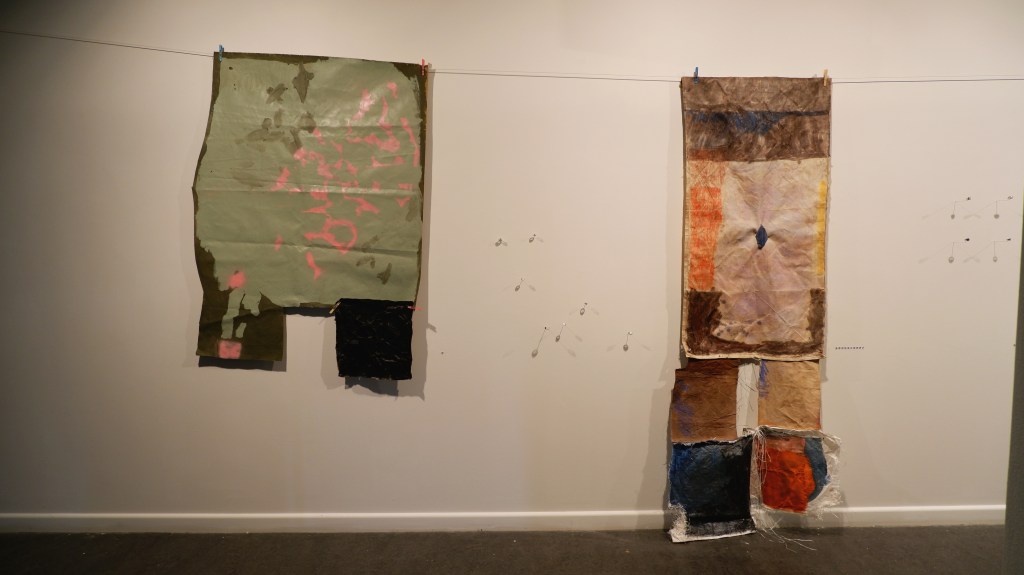 Left to right: Clementine Belle McIntosh, Titjikala to Gilgandra, 2023, Oil paint, old house paint, childhood acrylics, rabbit skin glue, euclayptus bark and leaf dye and thread on kate’s scrap fabric, cut up nylon wool pack, studio scrap fabric and cut up seed packaging. Jonathon Zalakos, Formless (18-21/30), 2023, Sterling silver. Clementine Belle McIntosh, Darlinghurst to Kaleen, 2023, Childhood acrylic, Tallulah’s spray paint and thread on old cut up painting. Jonathon Zalakos, Formless (16-17/30), 2023, Sterling silver. Clementine Belle McIntosh, Rozelle to Griffith, 2023, Acrylic paint and thread on Emily’s studio scrap fabric.