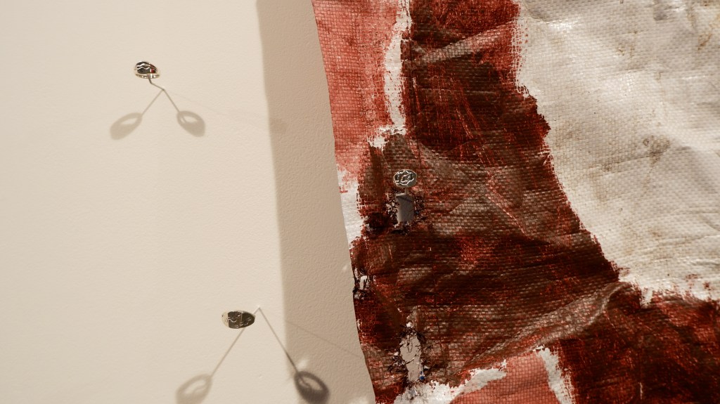 Jonathon Zalakos, Formless (22-30/30), 2023, Sterling silver. Clementine Belle McIntosh, Titjikala to Gilgandra, 2023, Oil paint, old house paint, childhood acrylics, rabbit skin glue, euclayptus bark and leaf dye and thread on Kate’s scrap fabric, cut up nylon wool pack, studio scrap fabric and cut up seed packaging (detail).