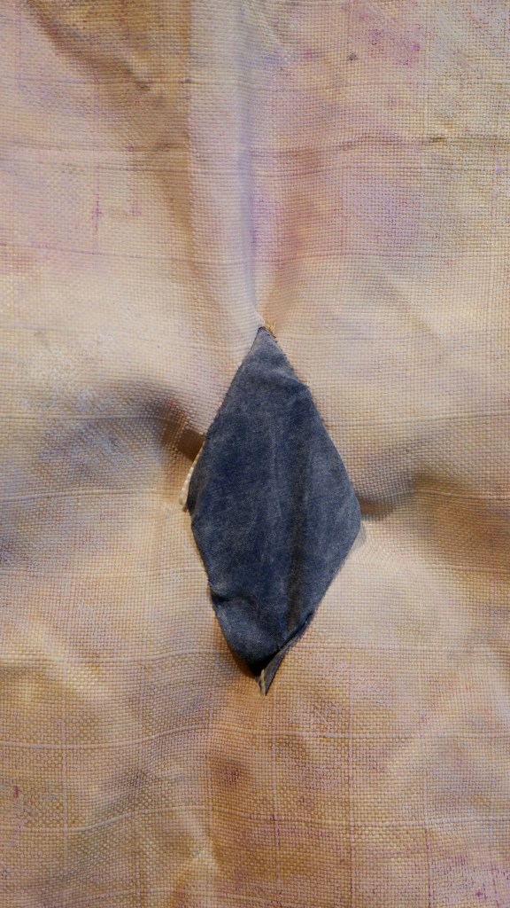 Clementine Belle McIntosh, Dickson to Gilgandra, 2023, old house paint, eucalyptus dye, avocado and onion skin dye, iron water and thread on roadside woolen blanket, cut up painting and Kate’s scrap fabric (detail).