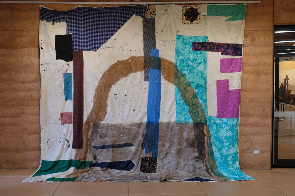 Bridge, Clementine McIntosh, 2023, secondhand quilting fabrics from Cooee Village, Iron Bark dye, iron water and thread on Paint ‘n’ Plus old painters drop sheet.