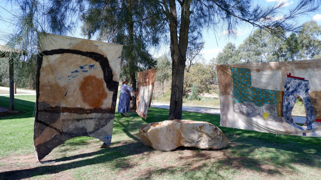 In Situ is an exhibition made-with the community, culture and environment of Gilgandra NSW – the waterhole meeting place of the Wiradjuri, Wailwan and Kamilaroi peoples. Emerging artists Clementine Belle McIntosh and Leilani Knight collaborate to produce a body of work representing the palimpsest of Aboriginal knowledge systems, local industries and material cycles forming their hometown. Repurposed objects such as wool packs, street signs, old painters drop sheets and mechanical parts are used as mark-making devices to transcribe the artist’s lived rural experiences in metaphors and stories of country.