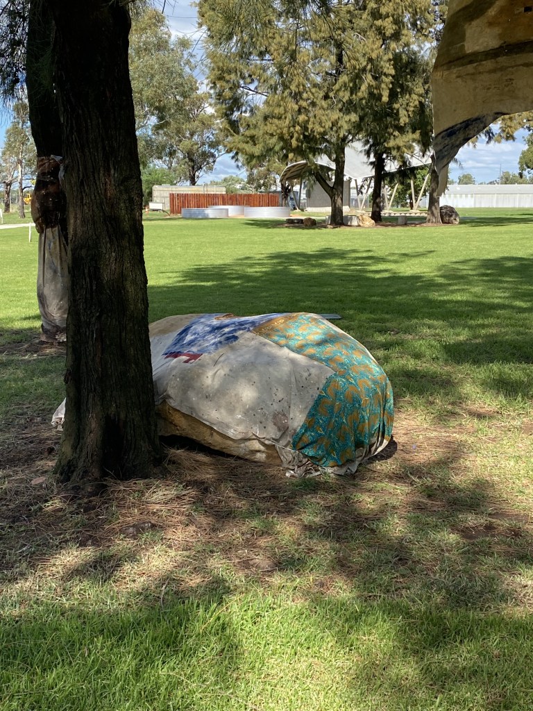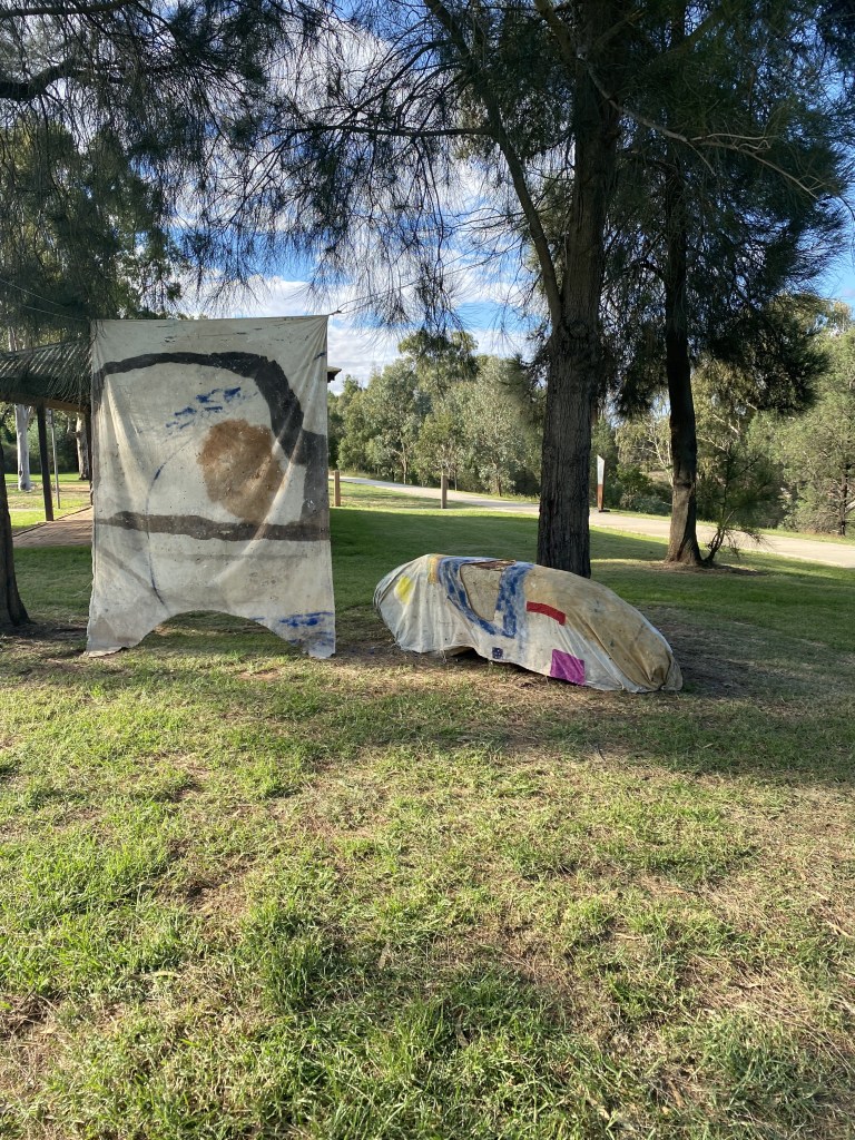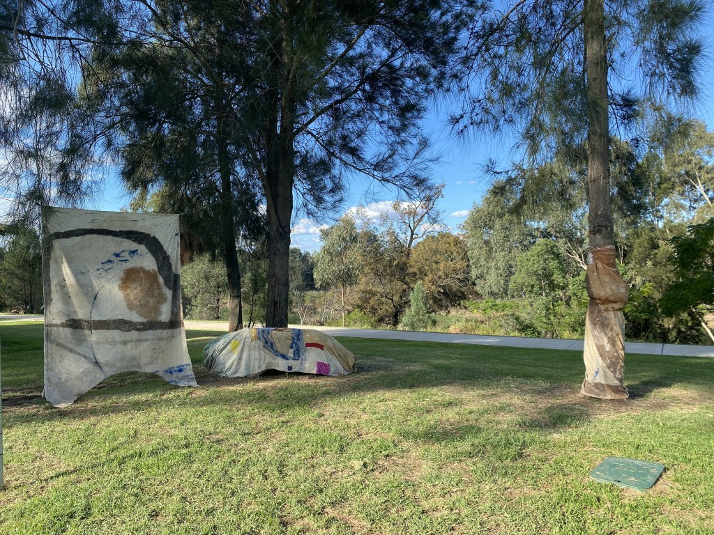 Outdoor installation: dry pigments, walnut oil, local plant dyes, iron water, thread and secondhand quilting fabric from Cooee Village on Paint ‘n’ Plus old painters drop sheet stuffed with eucalyptus bark and leaves.