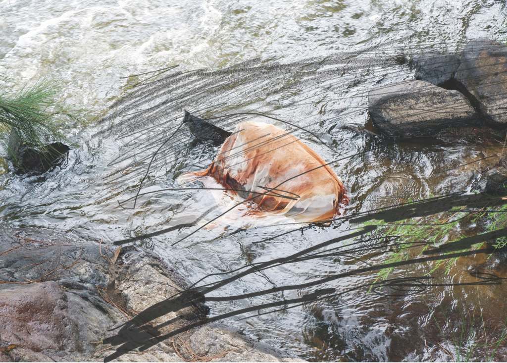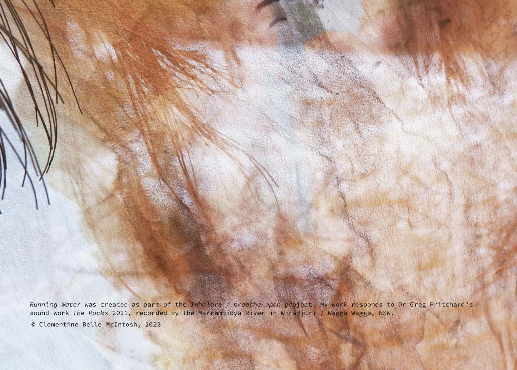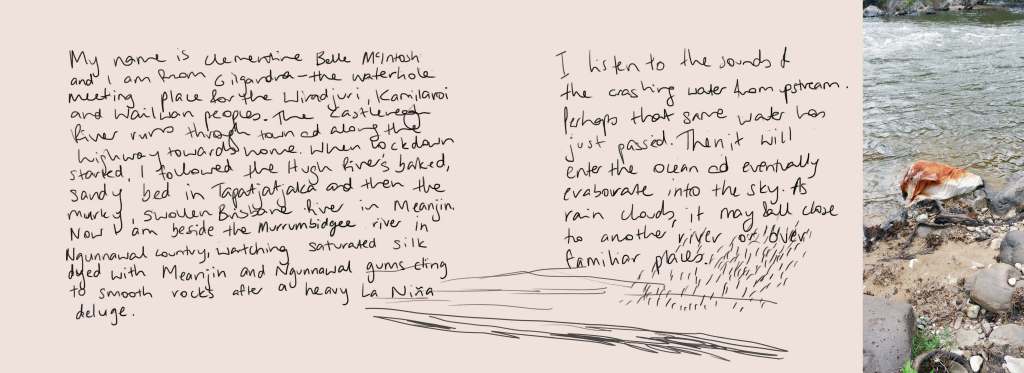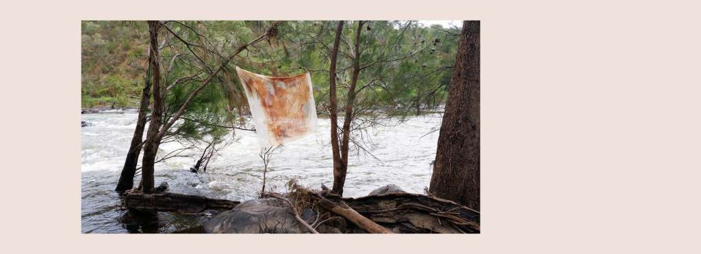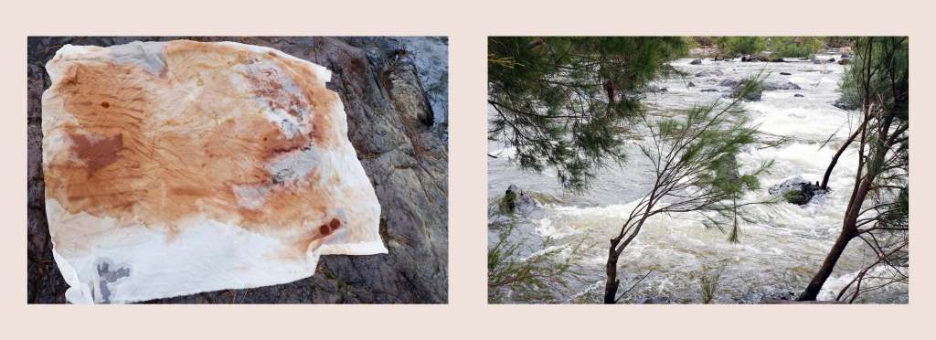 Silk skin on river rocks down the Murrumbidgee River – a work made in response to Dr Greg Pritchard’s soundscape and text created upstream in Wiradjuri country / Wagga Wagga. My book Running Water was created, photographed and printed across Meanjin, Ngunnawal and Gadigal country.