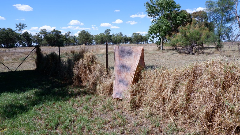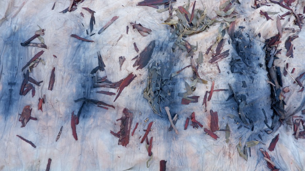 Buried and dyed textile cloth drying on farm fence in Gilgandra NSW, 2023