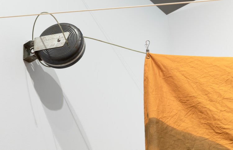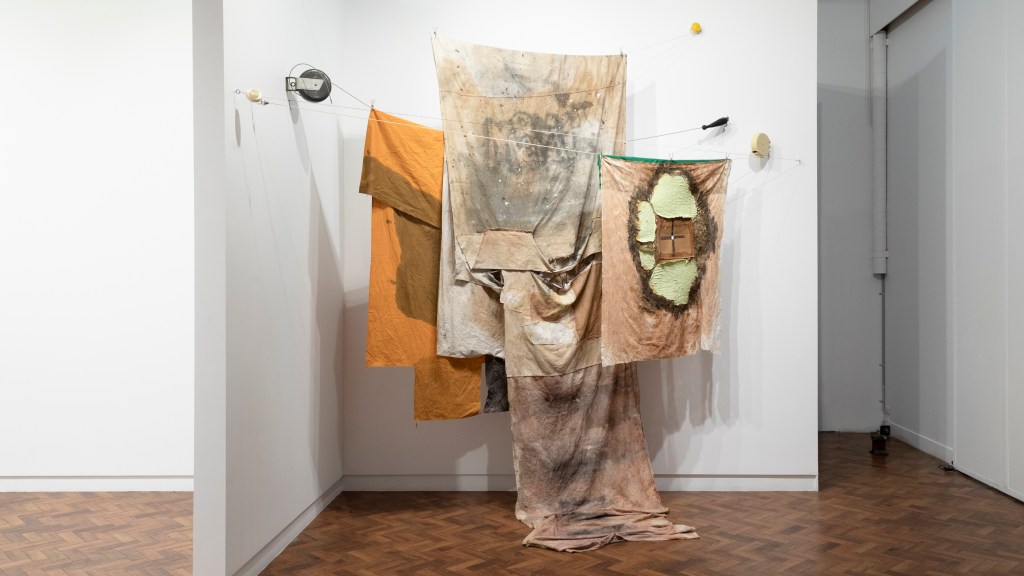 Installation view of Clementine Belle McIntosh ‘Inland’ featuring Clementine Belle McIntosh, ‘Clothesline’, 2023, eucalyptus leaf dye, eucalyptus bark dye, black tea dye, onion skin dye, nightshade weed stains, dam mud, rust, iron water, gifted secondhand fabric from Cooee Retirement Village Gilgandra, gifted corset fabric scraps, gifted old painters drop sheet, thread, found farming metal, eyelets, found cardboard target with 22 long rifle gunshot holes, papier-mâché Chemist Warehouse sale flyers, stainless steel pegs and ebay purchased retractable clotheslines. Collection of the artist. Photograph: Silversalt Photography