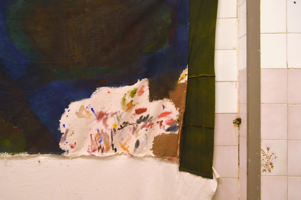 3. Clementine Belle, Eddie, Hugh and Walton’s Driveway, 2023, Dimensions variable, Alice’s leftover house paint and thread on Indigo’s scrap fabric. (detail)