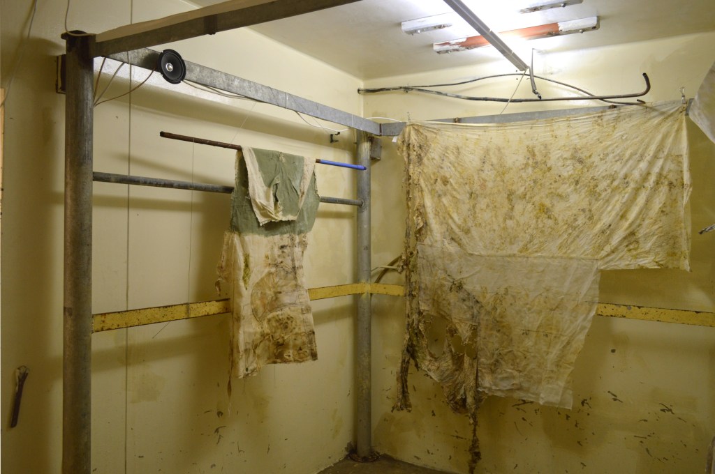Left to right: 3. Clementine Belle, Eddie, Hugh and Walton’s Driveway, 2023, Dimensions variable, Alice’s leftover house paint and thread on Indigo’s scrap fabric. 4. Kate Brown, vocal fold scale, 2023, Dimensions variable, Glass tiles, copper tint pigment, horseshoe magnets + plates, L hook.