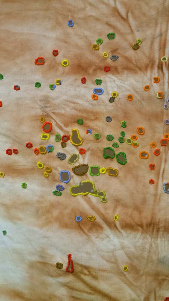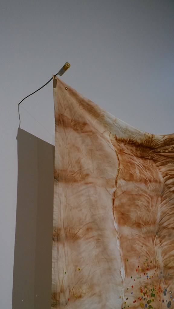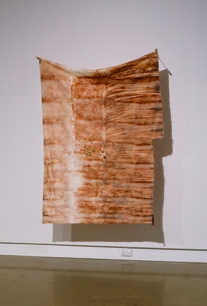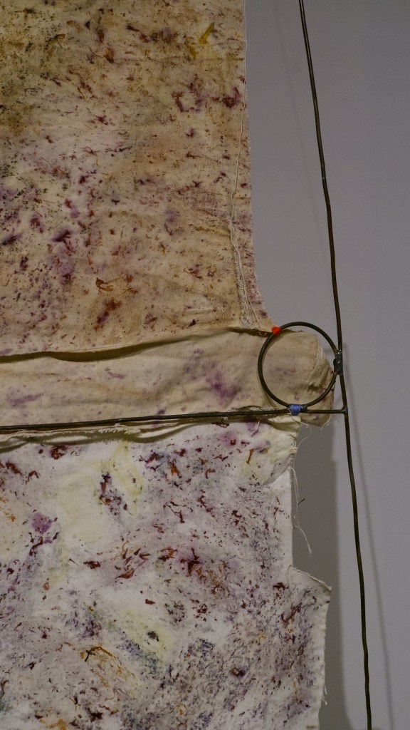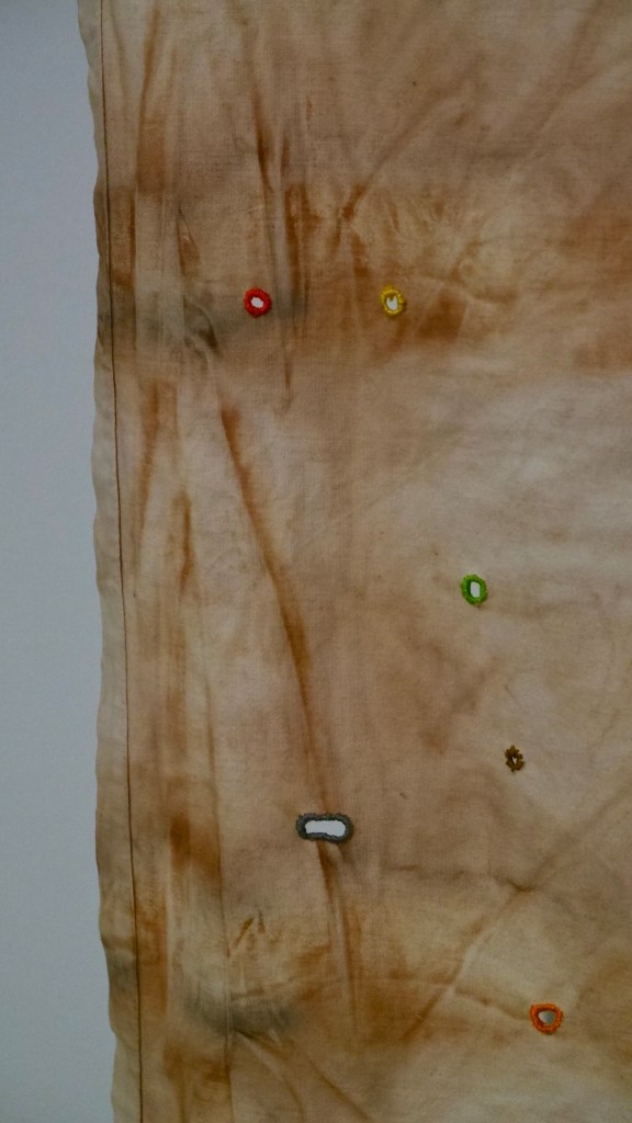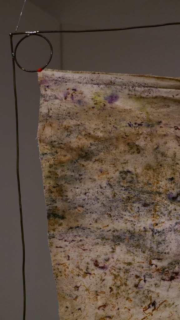 Floorless, 2025, secondhand cotton/polyestor bedsheet from Cowra Vinnies, Lichen dye, homemade copper ink, Eucalyptus dye, Acacia seed pod dye, Rosemary dye, various leftover dyes from workshop, homemade rust water, gifted embroidery thread from Carole, farm fencing wire and pearls from my Mother’s broken necklace – with support from The Corridor Project Artist in Residence Program