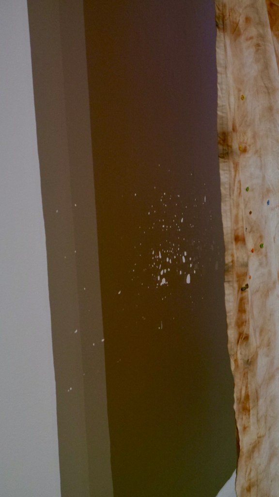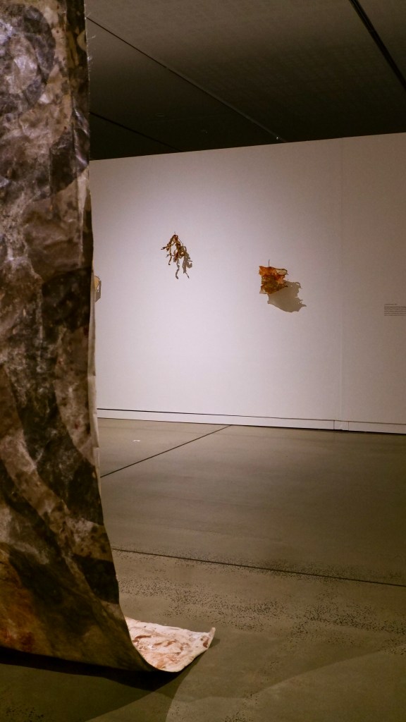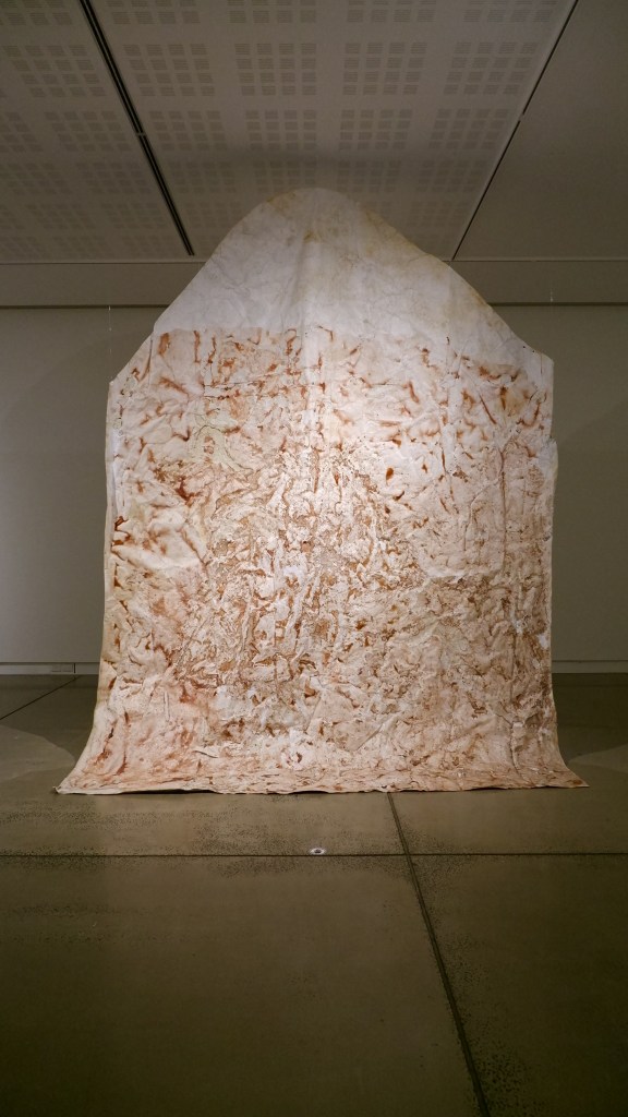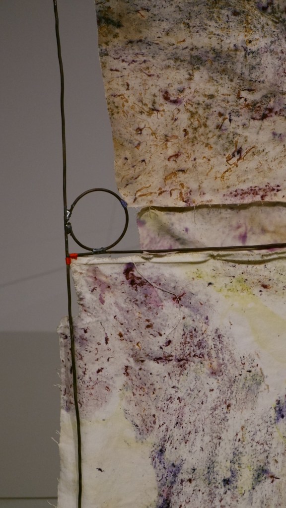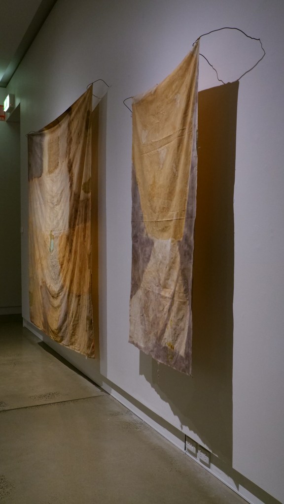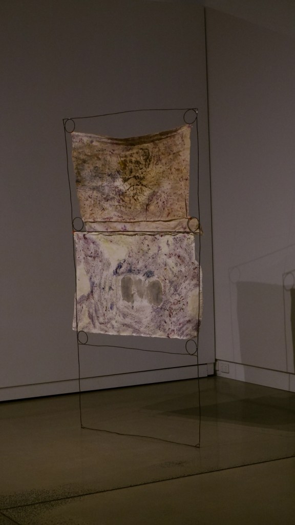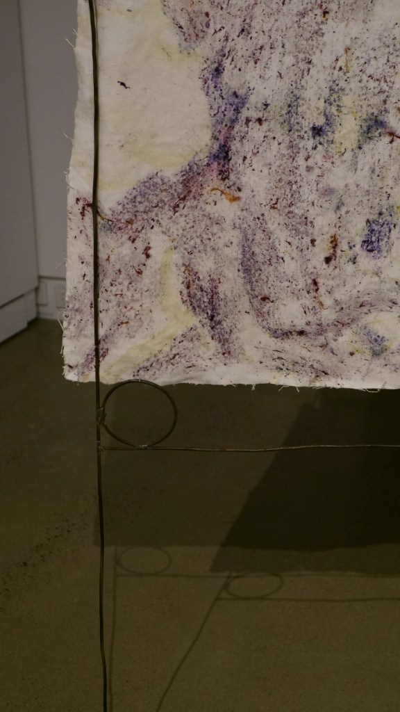 Floorless, 2025, secondhand cotton/polyestor bedsheet from Cowra Vinnies, Lichen dye, homemade copper ink, Eucalyptus dye, Acacia seed pod dye, Rosemary dye, various leftover dyes from workshop, homemade rust water, gifted embroidery thread from Carole, farm fencing wire and pearls from my Mother’s broken necklace – with support from The Corridor Project Artist in Residence Program