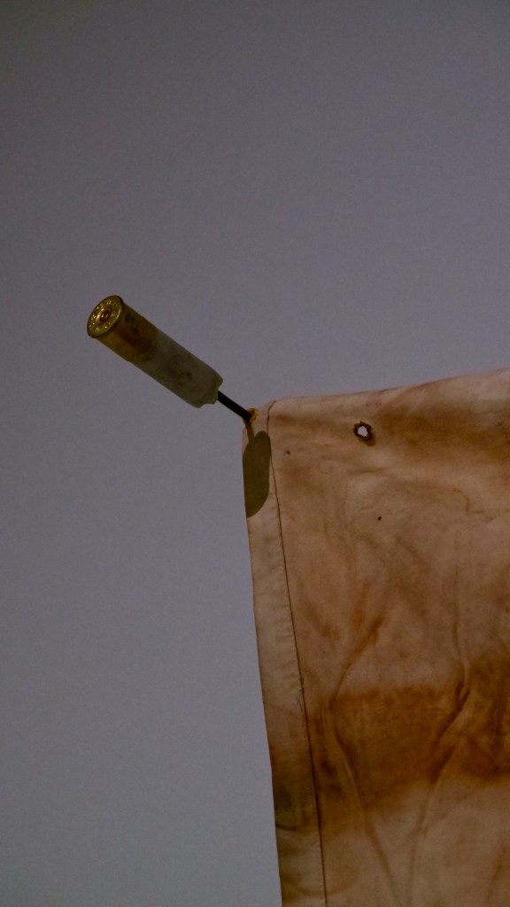 Sprinkle/Shot, 2025, Nancye’s old cotton sheet dyed with avocado skins, wrapped around a star picket for two months and shot with a shotgun by Booman, embroidery thread gifted by Helen and farm fencing wire