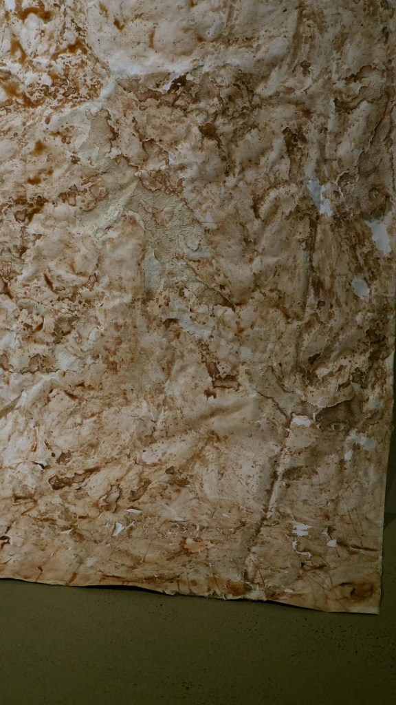 Out Of Home (detail), 2025, Gifted Dubbo McCafé tarp found on the side of the road by Doug, onion skin dye, avocado skin and pit dye, rabbit skin glue, personal paper waste, editions of the Gilgandra Weekly, flour, iron water