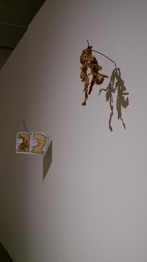 Turnover (detail), 2025, Gil op shop fabric, hibiscus flowers from Hayden’s garden, marigold flower dye, lemon juice, thread, farm fencing wire welded by Mick
